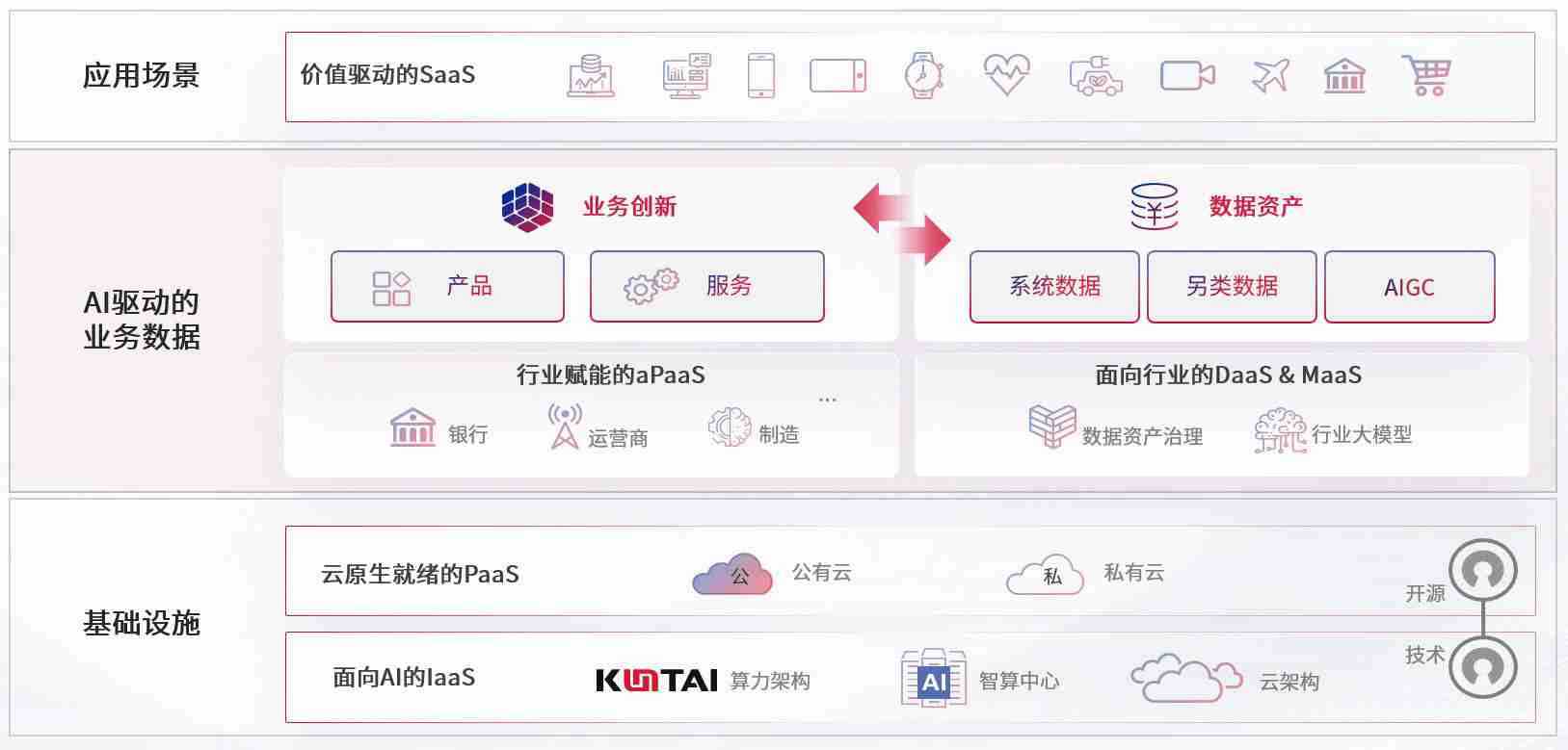 数字时代,,,围绕企业数字化转型的关键要素,,尊龙旗舰厅数码开创性的提出数云融合战略和技术体系框架,,,,着力在云原生、、、数字原生、、、、AI原生和信创产业上架构产品和服务能力,,为处在不同数字化转型阶段的快消零售、、、汽车、、金融、、、医疗、、政企、、、、教育、、、、运营商等行业客户提供泛在的敏捷IT能力和融合的数据驱动能力,,,构建跨界融合创新的数字业务场景和新业务模式,,助力企业级客户建立面向未来的核心能力和竞争优势,,,,全面推动社会的数字化、、、智能化转型升级。。。